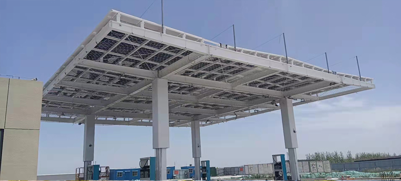 光伏一体化罩棚.外观漂亮、通透。晶硅光伏建材琉璃空明系列代替原设计屋面金属板,既能发电又具有防水功能,减少漏雨隐患。通过建材和光伏行业双重防火认证,更安全;屋面可支持踩踏,方便清理及运营维护,是绿色加油站标杆性建筑。
