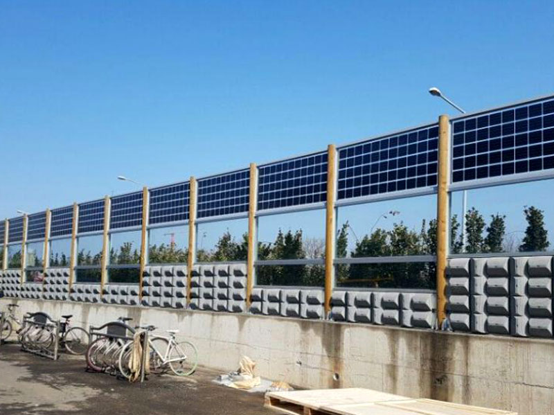 The first photovoltaic noisy barrier project in South Korea's, photovoltaic modules replace traditional sound barriers. Odd-numbered array method arrangement with unilateral lead out connecting wire, the design can fast connection and reduce energy loss and save space. Also the Bificial solar cell use can make 30% higher power generation in tol.