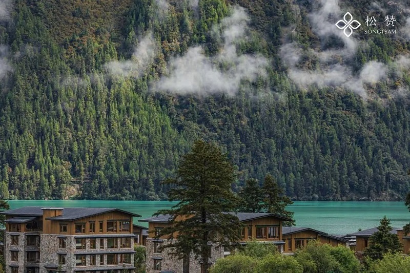 正值仲秋时节,湖面海拔3480米的巴松措,被一片蓊蓊郁郁的原始森林覆盖。这座筹备了近8年之久的松赞巴松措林卡坐落在南岸的结巴村,它是松赞迄今为止规模最大、设施最先进的酒店之一,更是松赞第一个绿色低碳酒店。