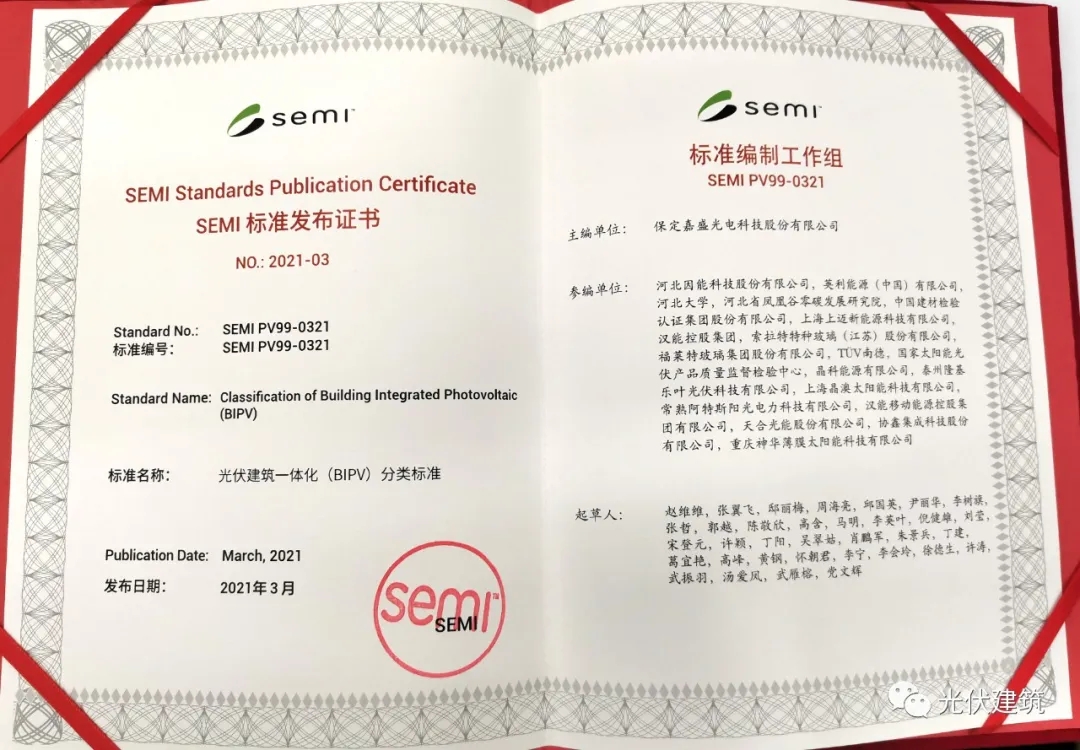 该标准由保定嘉盛光电科技股份有限公司(下称“嘉盛光电”)主编。“这是SEMI中国光伏标委会BIPV工作组成立后正式发布的首个标准,是SEMI产业标准中的首个中国BIPV标准,也是嘉盛光电主编的国际标准。”嘉盛光电总经理张翼飞介绍,“标准发布实施将对BIPV产业规范发展产生重要影响,填补中国企业参与该行业标准编制的空白,标志着我国BIPV行业正在从国际标准制定的跟随者开始向标准制定的并跑者转变。”