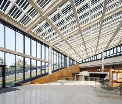 造型优势:琉璃空明系列通过定制化版型及透光率,与建筑本身简洁外观造型融为一体,犹如一颗三角形透明琉璃玉石散落绿地中,既实现了建筑透光、保温、隔热要求,也保证了发电效果,协助建筑拿下了世界最权威绿色建筑奖项LEED最高级别认证、2013年度精瑞奖最高奖项之—“建筑设计金奖”。