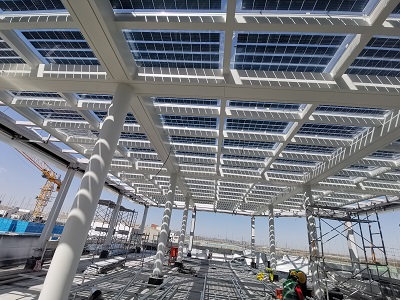 建筑主要应用了光伏采光顶这一BIPV应用形式,使用了嘉盛光电琉璃·空明系列产品。产品在满足建筑外观设计要求、采光需求的同时,还将太阳能源源不断转化为绿色电力,并且结合微电网储能新型配电方式,接纳自身发电电力、改善建筑电力系统性能、提高电源质量。