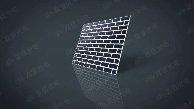将蓝黑色电池片通过划片技术裁切成砖头大小,厚度仅有4毫米,重8.5公斤,呈青砖样式堆砌在建筑外立面,能发电且美观。