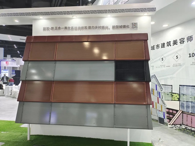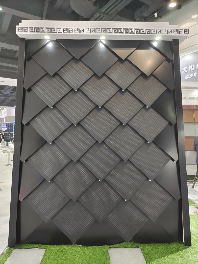 本届展会,无锡嘉盛瞄准BIPV在建筑的不同应用场景和方式,从建筑屋面到建筑立面再到建筑附属物等应用场景提出解决方案,不同场景解决方案对应不同的光伏建材,其产品包括青砖、黛瓦·羽、黛瓦·青云、光伏发光地砖等。