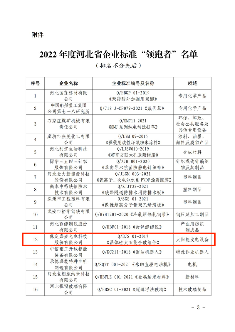 2022年英利嘉盛牵头承办2个地方标准制修订计划项目,主编发布标准1项,参与发布标准4项,提交国际ISO标准提案1项,获得“河北省企业标准领跑者”称号。